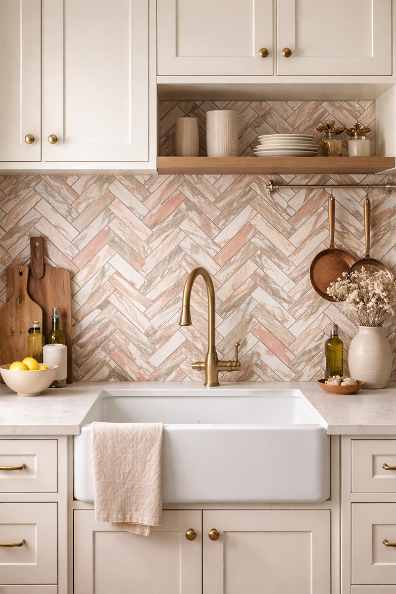 Herringbone is a pattern with a distinctive “V” shape which has been formed in this particular item from chips size of 98 mm X 25 mm. Herringbone mosaic has recently become quite trendy for variety of residential and commercial decoration.